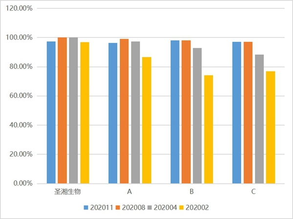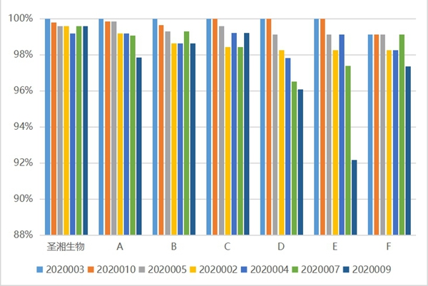 圣湘生物试剂阴性样本检测结果的符合率也领先于其它主流厂家,具有较好的特异性。综合室间质评结果来看,圣湘生物新冠病毒核酸检测试剂检出率、重复性及特异性上具有较大的优势。